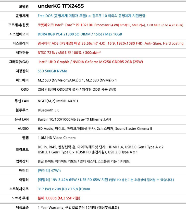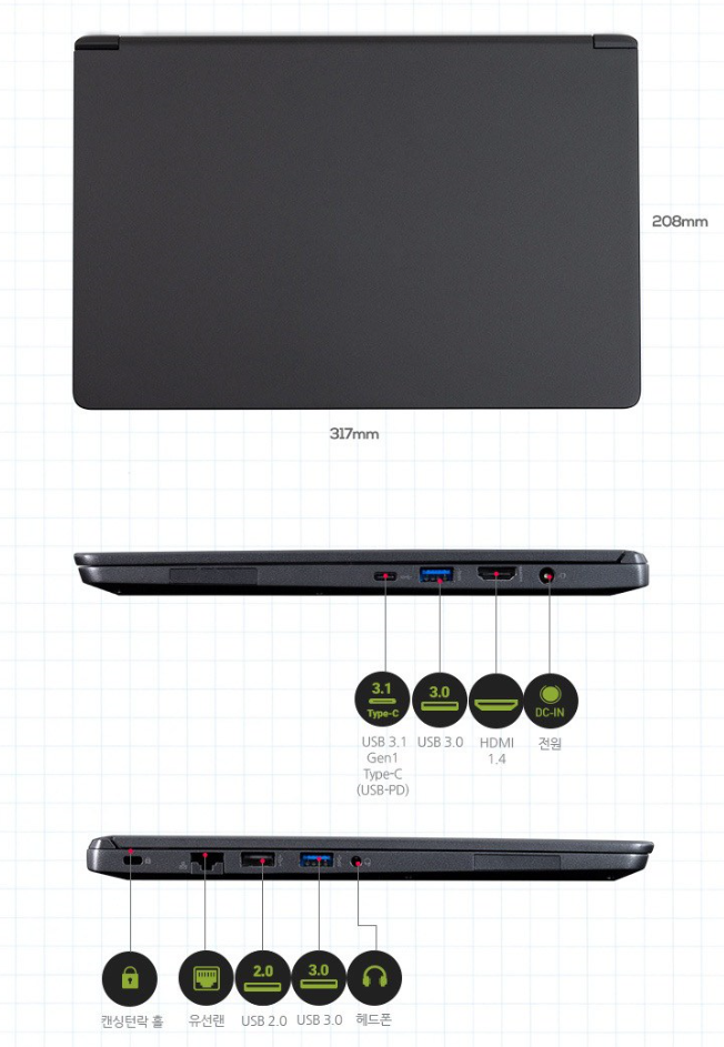 크기/무게 : 317 x 208 x 16.8 mm / 본체 1,080g [M.2기준]