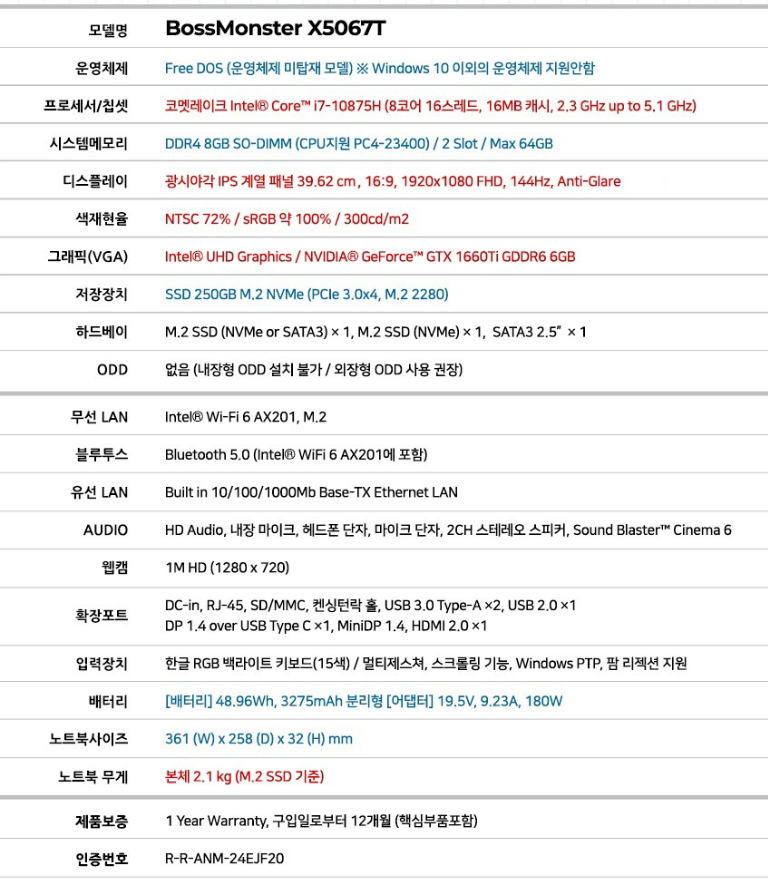 디스플레이 : IPS 계열패널 / 39.62cm[15인치] FHD / 144Hz / 색재현율 sRGB 약100% 300cd/m2