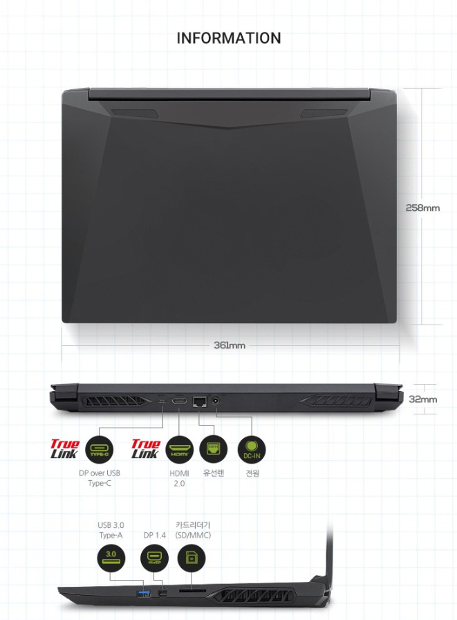 크기/무게 : 361 x 258 x 32 mm / 본체 2.1kg