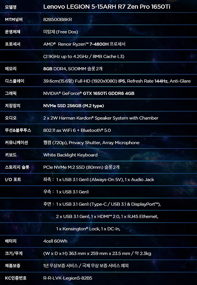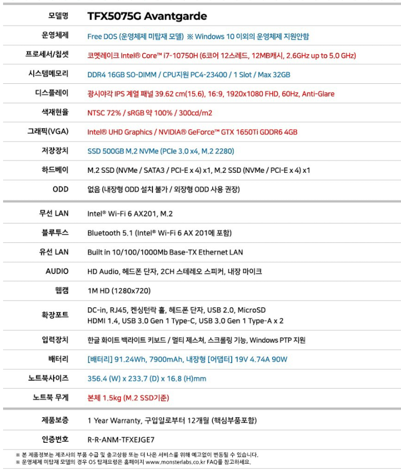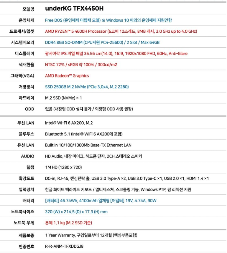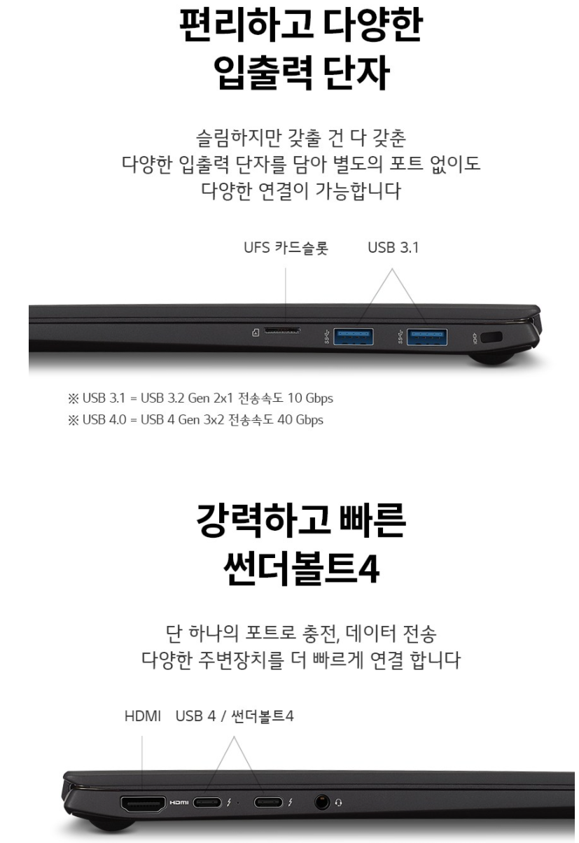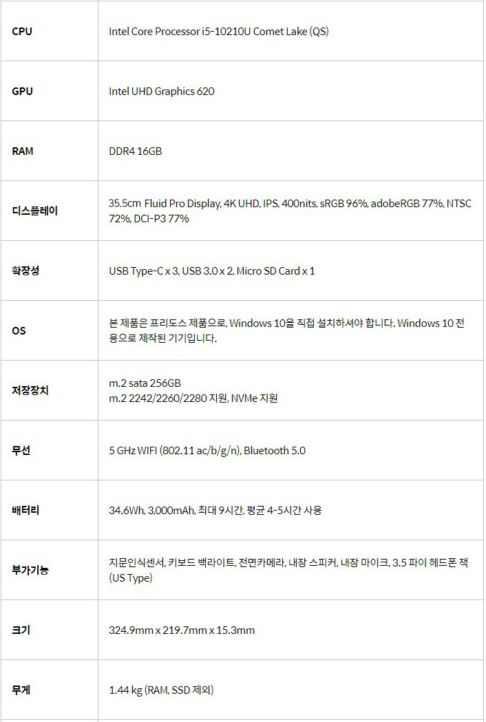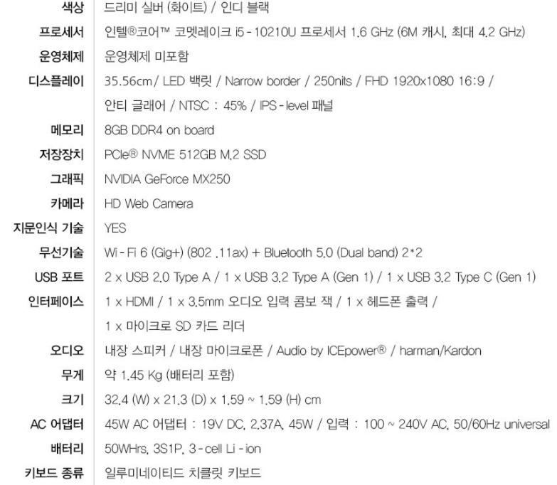 그외 : 와이파이 6 / 블루투스 5.0 / 지문인식 / 타입C 포트 1개 / USB3.2타입 1개 / USB 2.0타입A 2개 / 마이크로SD카드리더 1개