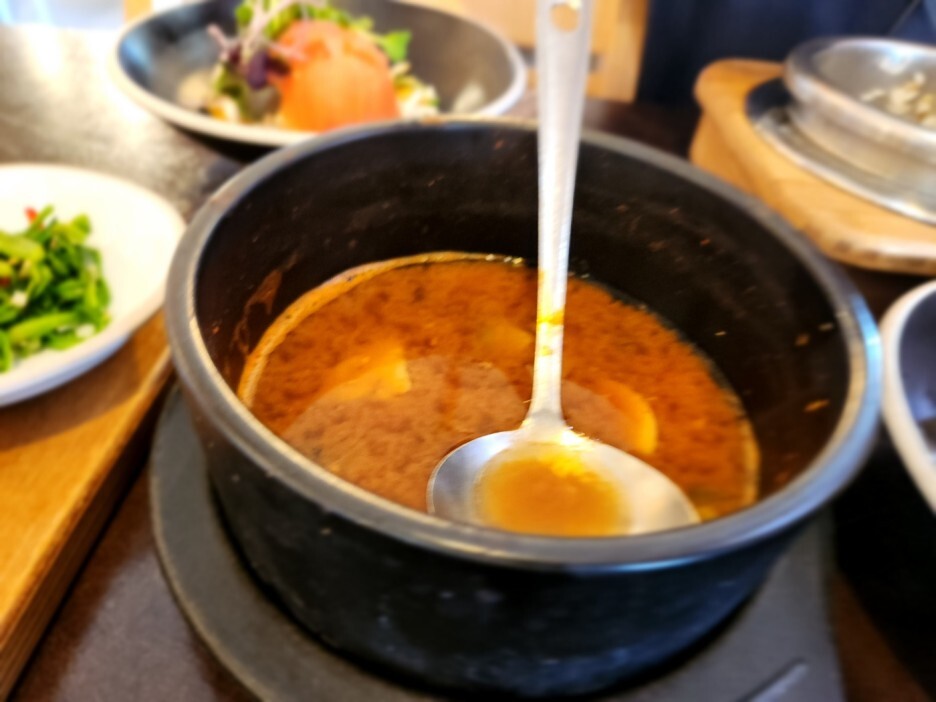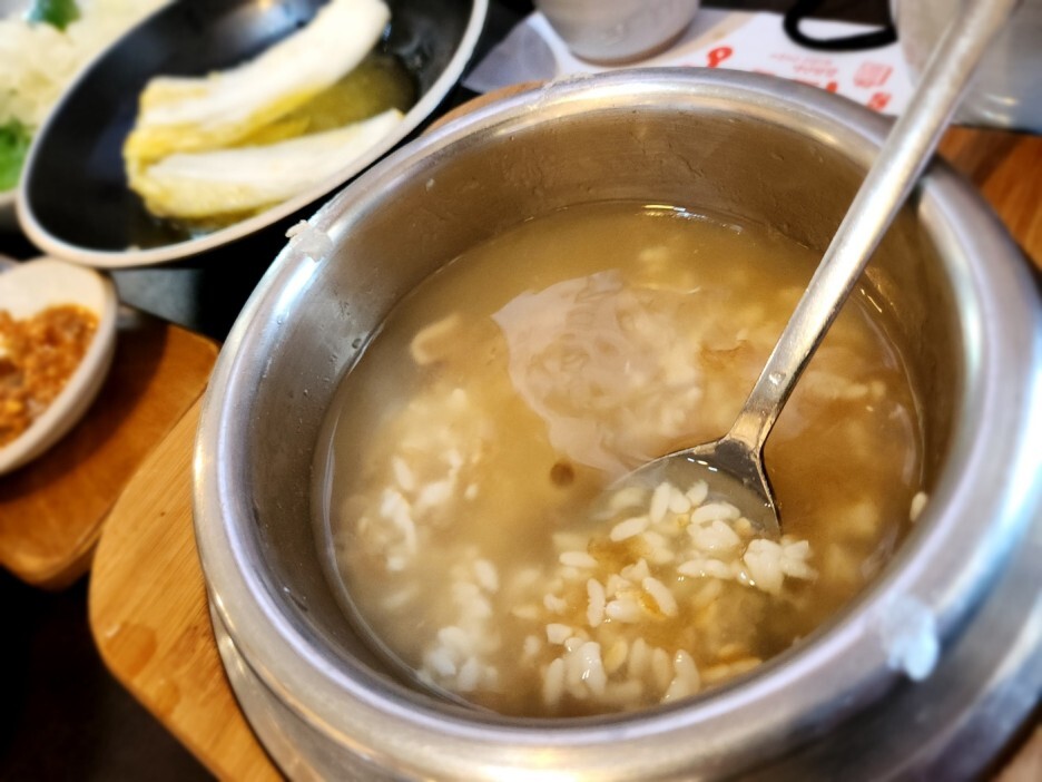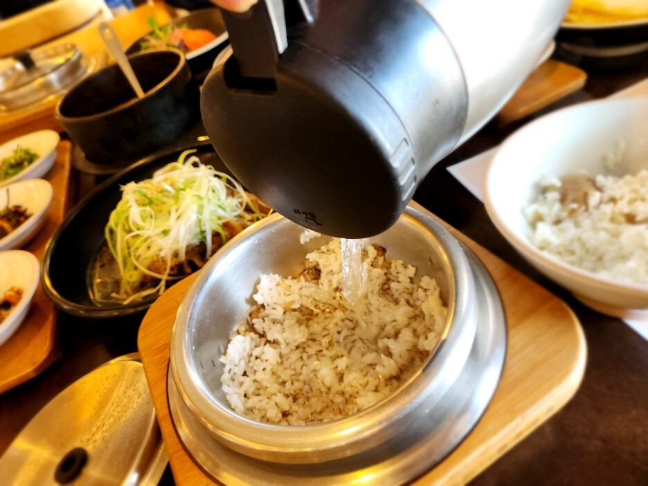 돌솥밥에 있는 밥을 밥그릇으로 덜어내시고 따뜻한 보리차?[구수했습니다 !] 를 넣어주시고