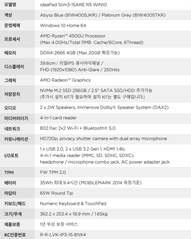 레노버 아이디어패드 노트북 어비스블루 Slim3-15ARE R5 WIN10 (라이젠5-4500U 39.6cm WIN10 Home)