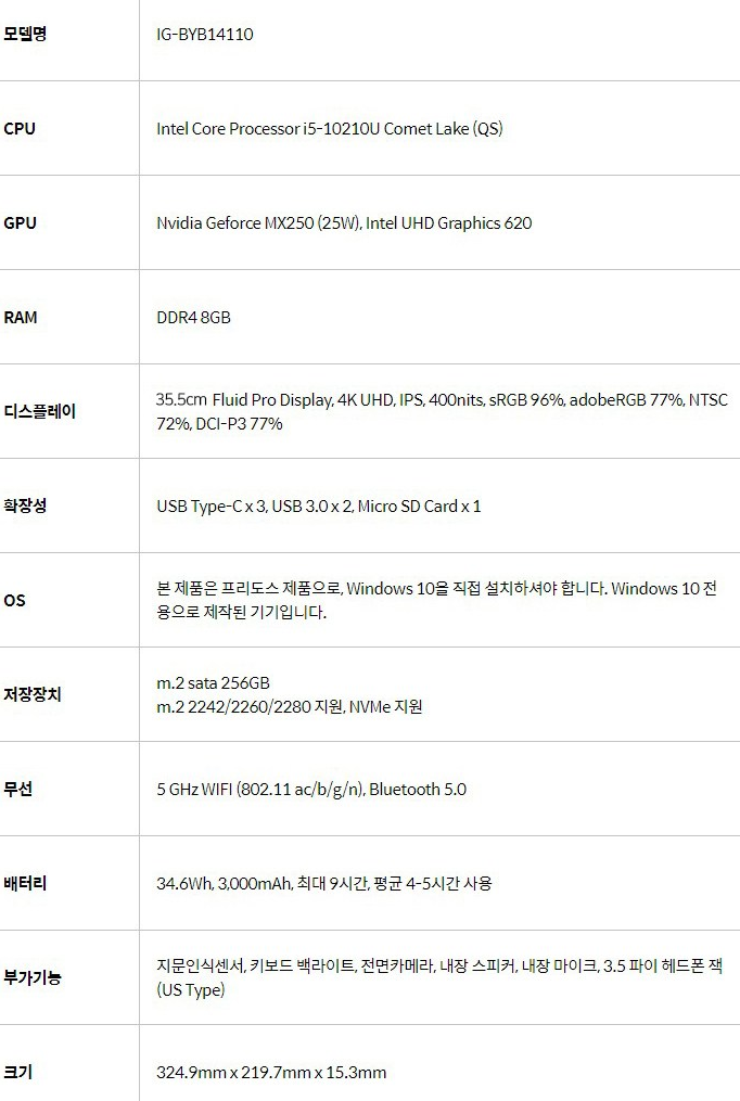 이그닉 바이북 프로 14 리프레시 노트북 IG-BYB14109 (I5-10210U 35.5cm WIN미포함 UHD IPS)